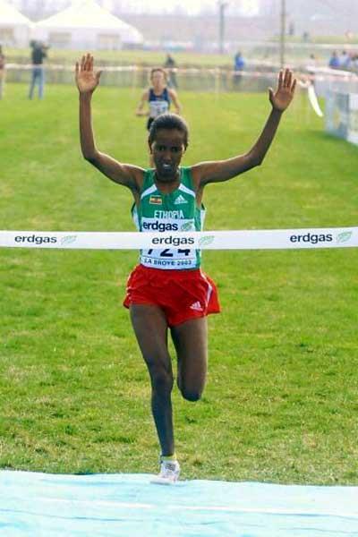 Edith Masai of Kenya crosses the finish to retain her Women's short course title