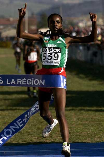 Tirunesh Dibaba (ETH) follows Isabella Ochichi (KEN) - 2005 World Cross Country