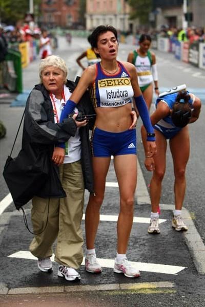 Alina Adriana Istudora is given help by an official after the World Half Marathon in Birmingham
