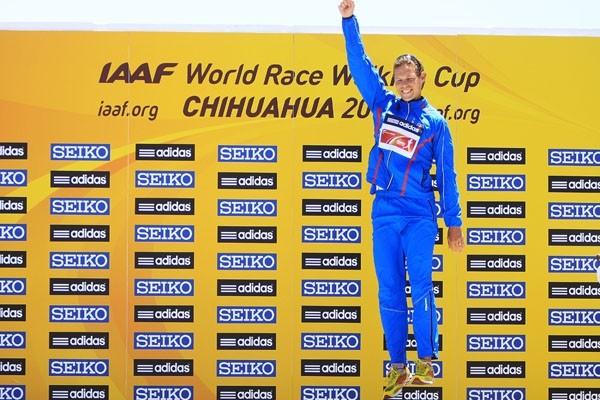 09 OCT 2012 Matej Toth celebrates winning gold on the World Race Walking Cup podium in Chihuahua