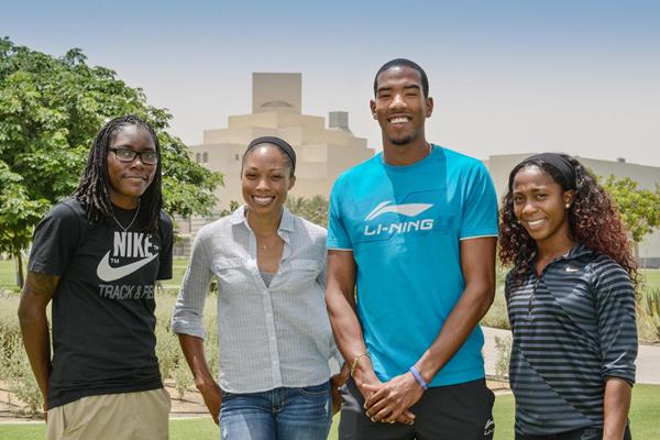 08 MAY 2013 Brittney Reese, Allyson Felix, Christian Taylor and Shelly-Ann Fraser-Pryce outside the Olympics Past and Present Exhibition in Doha