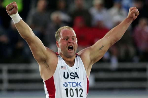 09 OCT 2012 Adam Nelson celebrates a new season's best 21.73m in Helsinki's Shot Put final