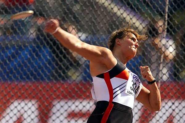09 OCT 2012 Francoise Mbango (left) with fellow Edmonton 2001 medallists Lebedeva and Marinova