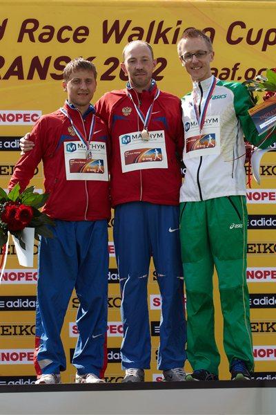 15 MAY 2012 The men's 50km podium in Saransk: Igor Erokhin, Sergey Kirdyapkin and Jared Tallent