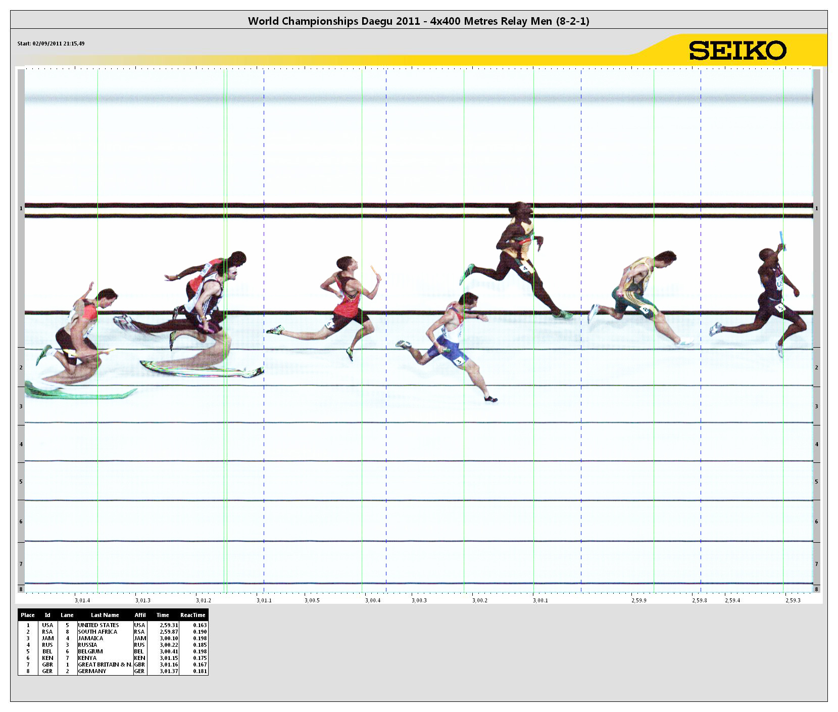 Viewing IAAF World Championships in Athletics > 13th IAAF World Championships in Athletics > 4x400 Metres Relay
