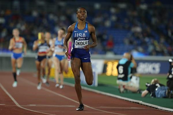 11 MAY 2019 USA's Courtney Okolo in the women's 4x400m at the IAAF World Relays Yokohama 2019